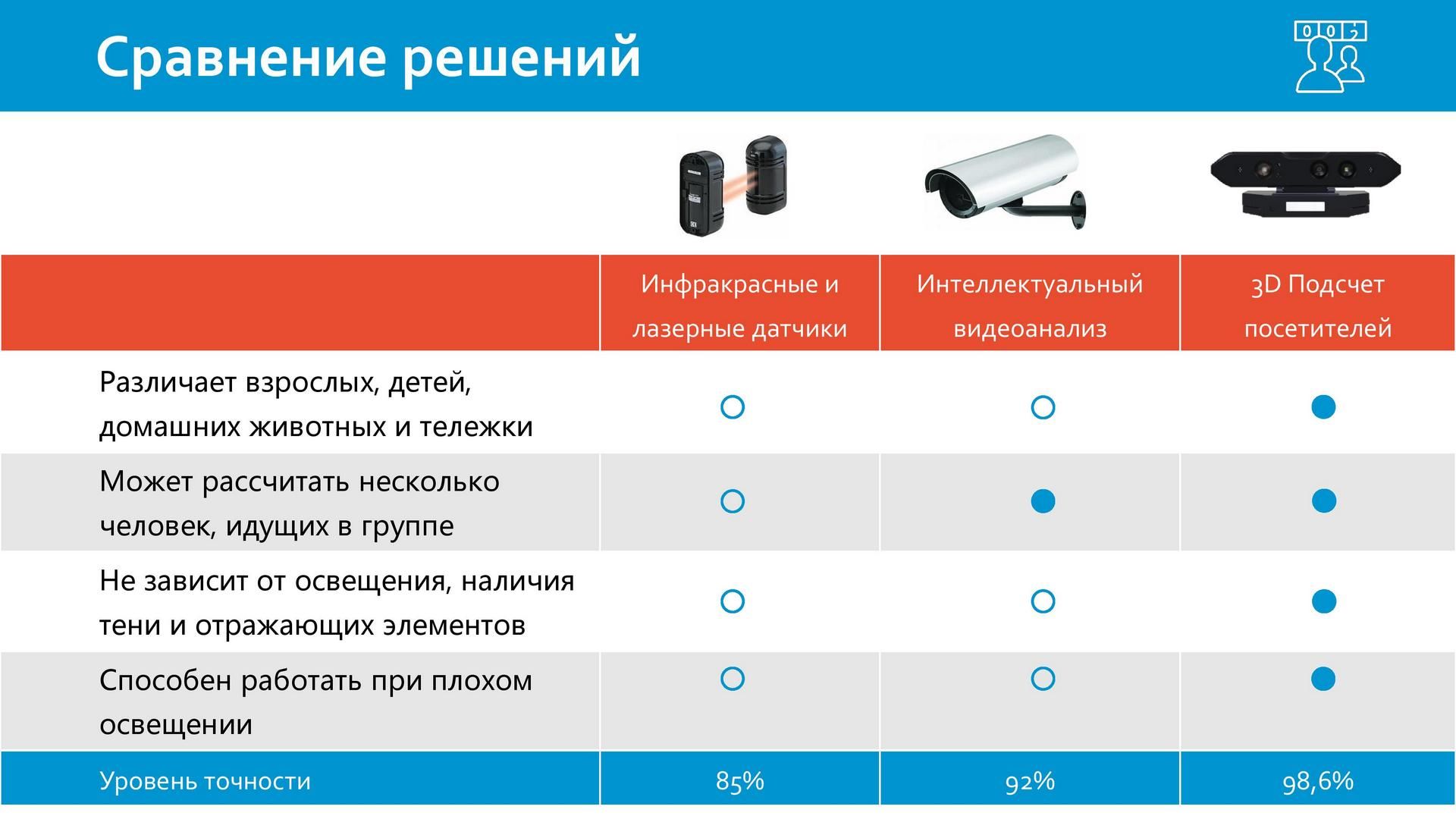 ● Точность подсчёта 98,6% в среднем на реальных объектах.