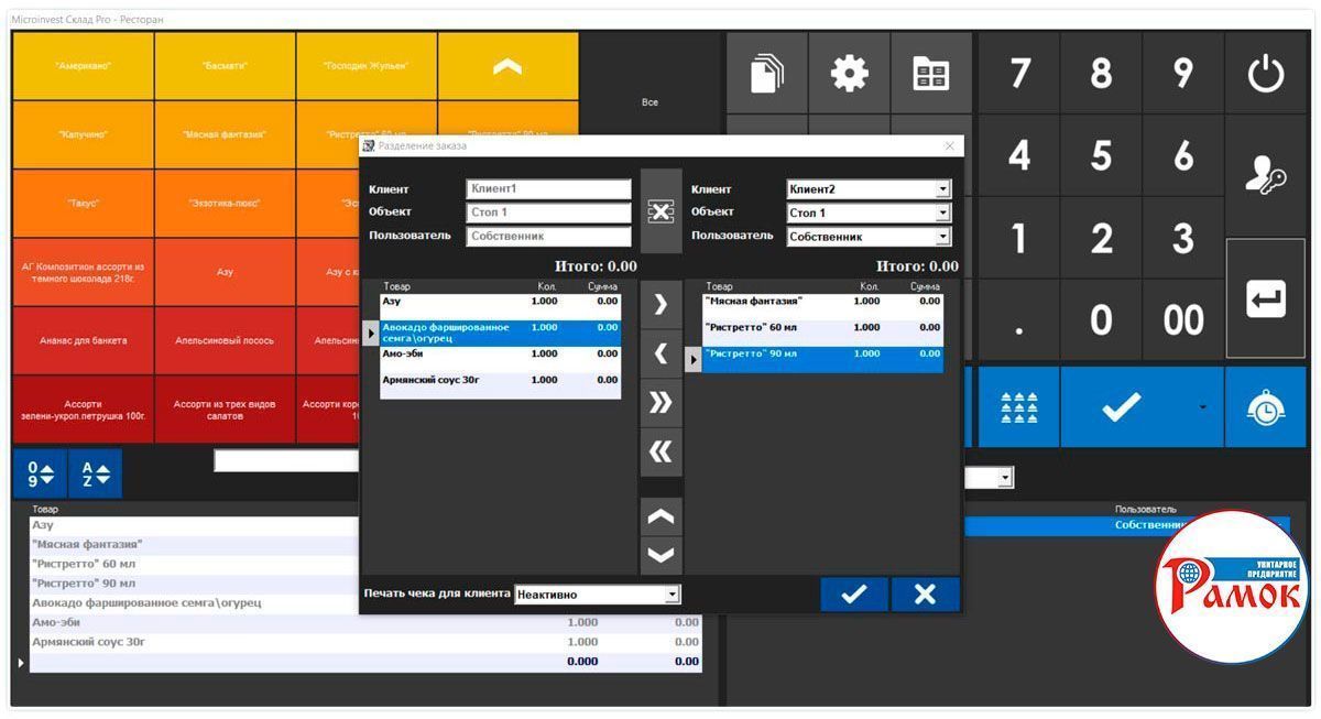 - Работа с заказом (разделение, перемещение на другой стол и др.);