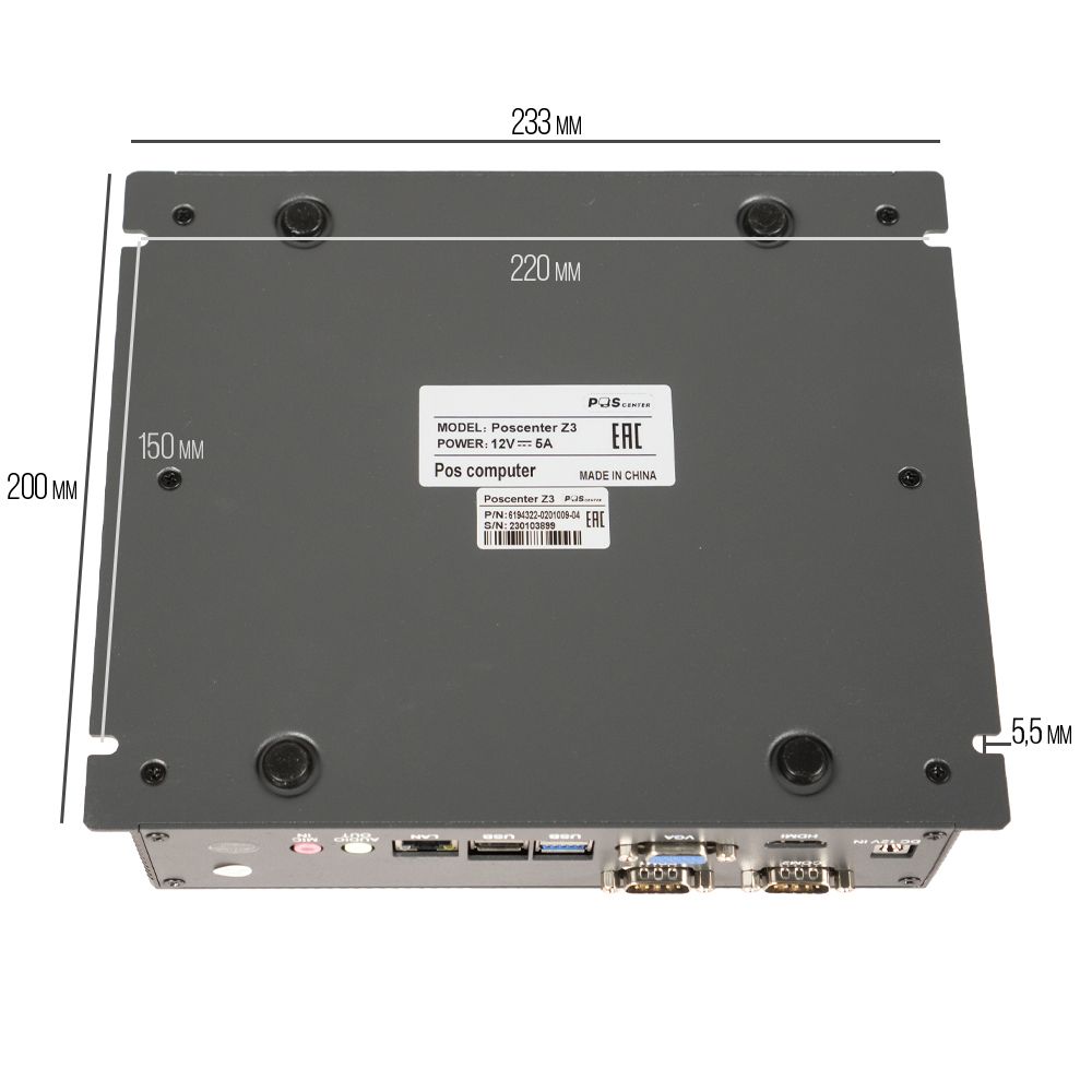 Особенностью данной модификации POScenter Z3 является возможность крепления на любую горизонтальную или вертикальную поверхность с помощью 4 винтов. Таким образом, теперь можно удобно разместить компьютер на стене или, например, под столом, освободив рабочее пространство сотрудника. Расстояние до центров крепления 150х220 мм, диаметр отверстий 5,5 мм.
