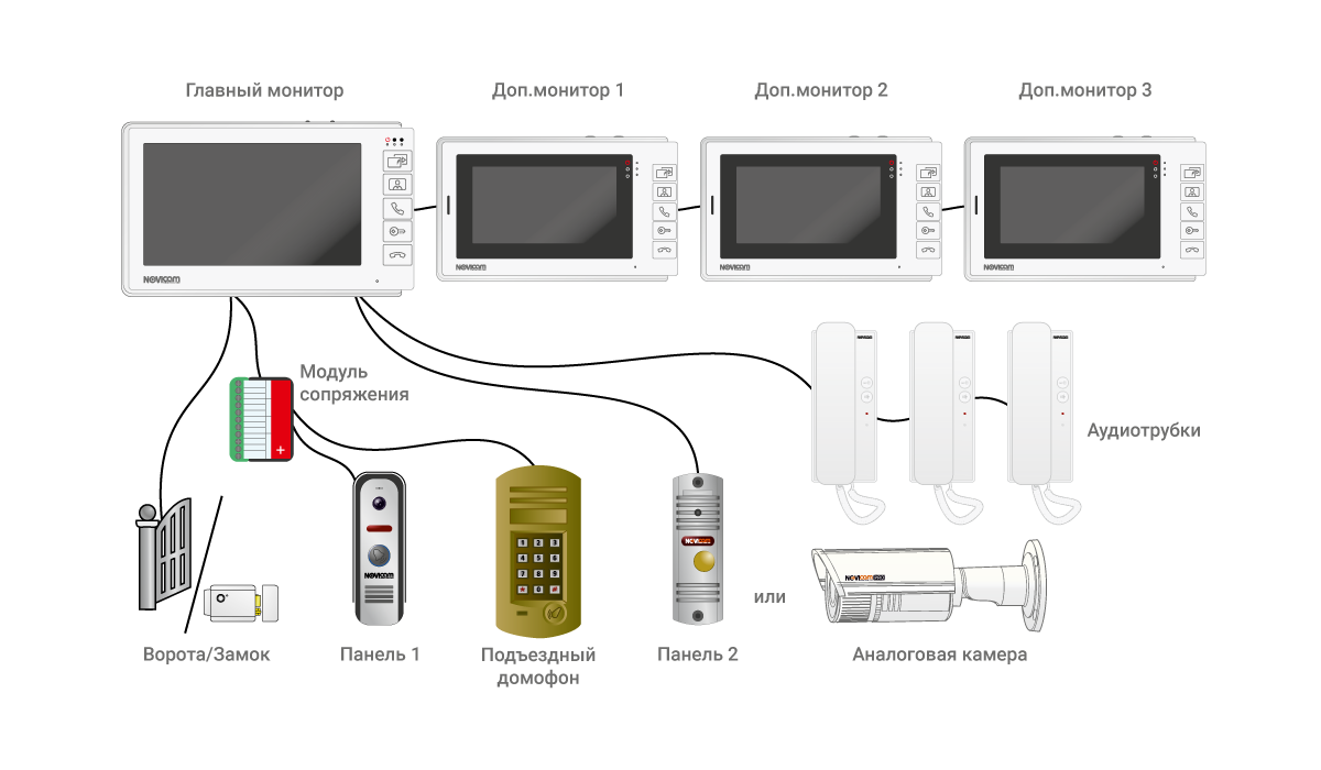 - Возможно подключить: до 2 вызывных панелей; до 3-х доп. мониторов; до 3-х аудиотрубок