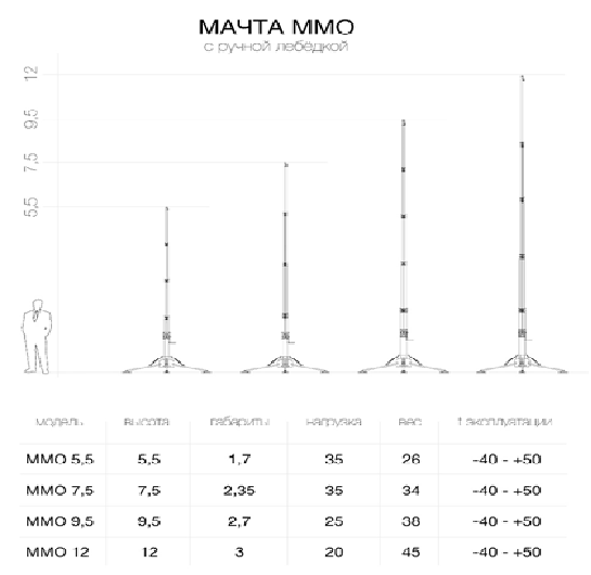 Мачты типа ММО отличаются от остальных простотой подъёма, поэтому наиболее подходят для мобильного использования, когда мачту необходимо часто собирать и разбирать