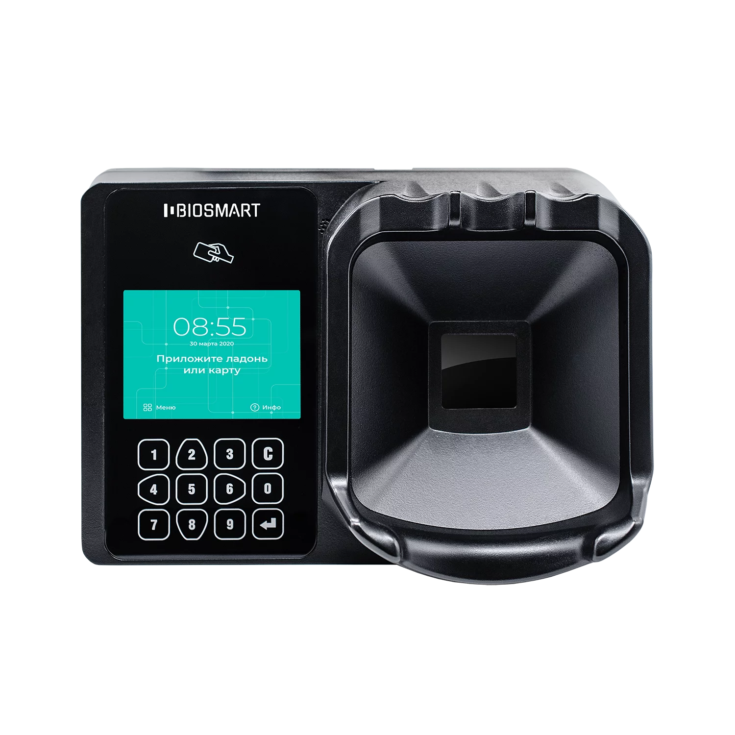 Терминал BioSmart PV-WTC — это биометрический сканер, который идентифицирует человека по рисунку вен ладони, пластиковой RFID-карте или смартфону.