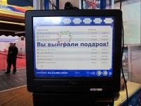 С помощью данного терминала был проведен розыгрыш подарков. На стенд компании "Рамок" приглашались гости, которым вручались календарики со штрихкодом. Штриход считывался встроенным в терминал считывателем. Один штрихкод давал право на одну заказанную мелодию.